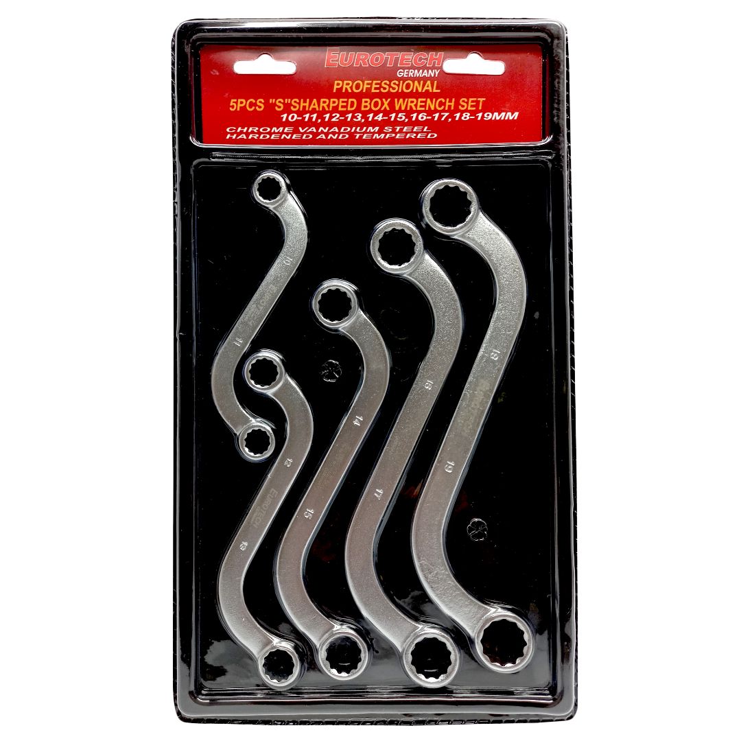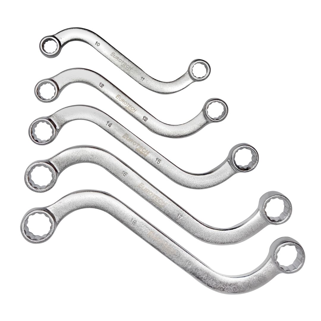 Llaves estriadas curvas tipo S – Diseño ergonómico, facilita el trabajo en espacios reducidos y de difícil acceso – Medidas: 10 x 11 mm / 12 x 13mm / 14 x 15 mm / 16 x 17 mm / 18 x 19 mm – Material: Cromo Vanadio